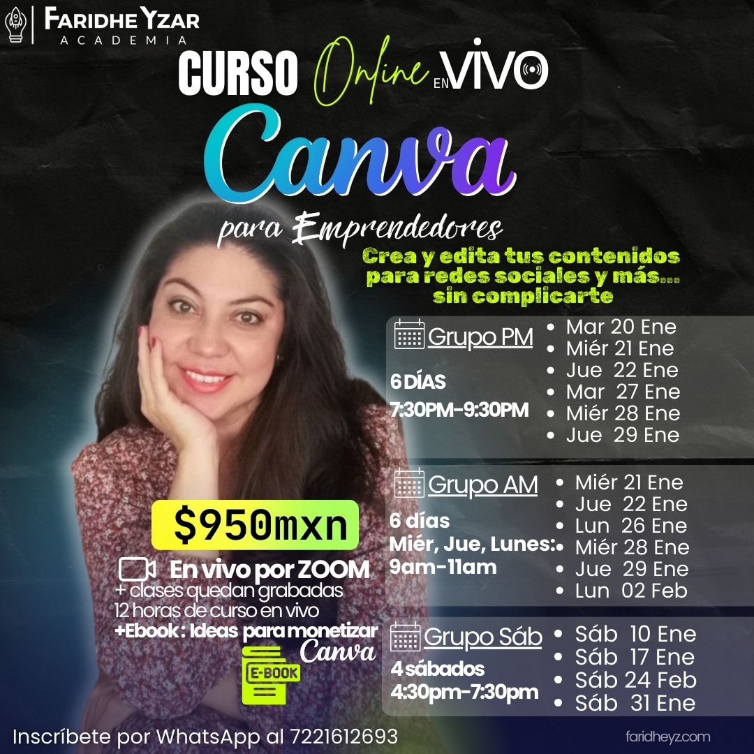 ✅ Acceso por 1 año para que puedas ingresar a nuevas fechas de nuevos cursos de Canva en vivo.